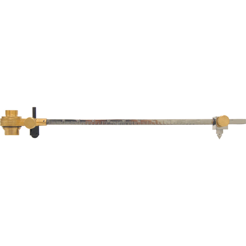 Fits onto the nozzle end of the blowpipe, between the head and the cutting nozzle. Offers optimum two-handed control, fitted with a sliding centre device and a roller ball support spigot, ideal for accurately cutting larger diameters. Swing arm is graduated for direct reading of circle diameter (2 x radius). High quality brass head and screws with chrome plated steel swing arm and centre slide. Also compatible with cutting attachments.